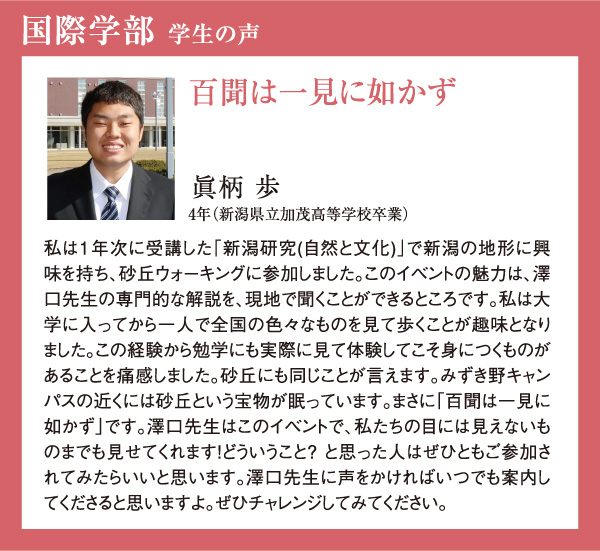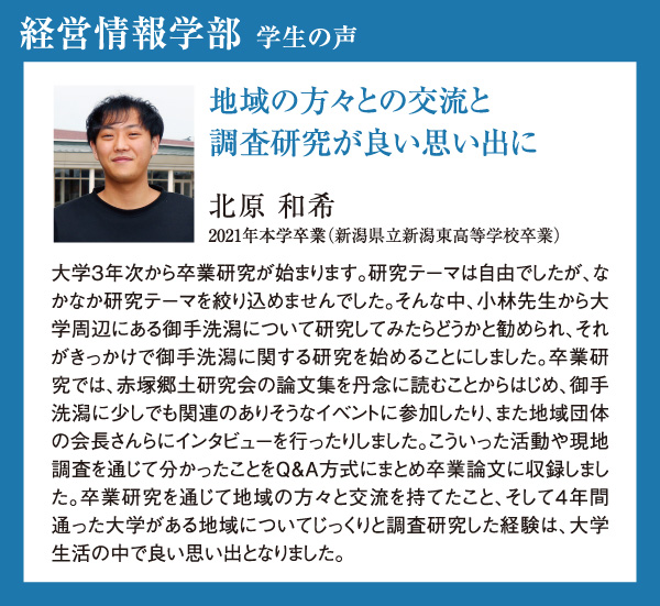 新潟国際情報大学は、地域社会に開かれた大学として、公開講座や産官学連携はもとより、地域連携活動などを通じてこれまで培ってきた教育・研究の成果を広く社会に還元するため、様々な取り組みを推進する。