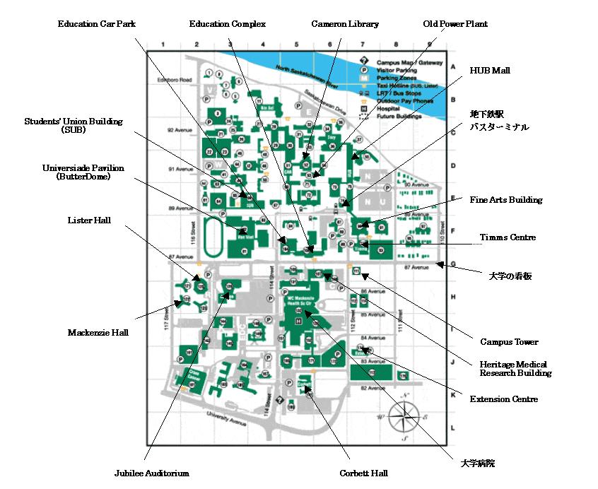 カナダ・アルバータ州エドモントン市にある州立大学です。日本の大学に比べるとかなり大きく学内移動も結構大変です。下の地図の一区画は大体250mくらいです。