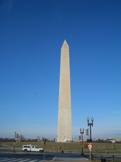 建造物の中では一番高いワシントン記念塔(写真左。よく見ると、小さな旅客機が塔に向っているようにも見えます)と、やはり大きな国会議事堂と が、街のほとんどのところから見え、これら中心的な二つの建造物が、両側の二つの軸となって都市を構成しています。その両者の間のスペースに、広い公園や 無数の行政機関、博物館、美術館などが整然と並んでいます。