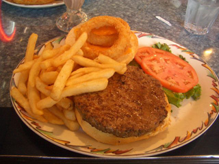 お昼御飯を、アメリカで初めて「ダイナー」(ハンバーガーやポテトなどのアメリカ料理を安く食べられる所)で食べました。あまりに巨大な、一日分 のカロリーはゆうにあるハンバーガーを食べました(写真中央)。これに甘ああいチョコレート・シェーキがつくので、もう理性を働かせたら完食なぞできませ ん。パチンコ屋と見間違えるような外観と、必要以上にハイテンションな店員、安いがゆえに年金生活者であふれている店内など、驚くことが多かったのです が、まさにイメージとしての「アメリカ」のエッセンスが詰まっているようでした。でもダイナーの多くは、実はギリシア人が経営しているということなども友 人に教えてもらいました。