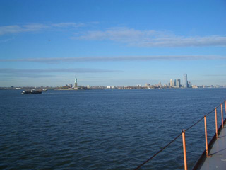 スタテン島とマンハッタンを結ぶのは、24時間運航(!)の無料フェリーです。約20~30分で着くのですが、途中で自由の女神のそばを通り過ぎ、とてもいい景色です(写真左はフェリーからみた自由の女神とマンハッタン)。