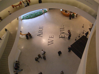 グッゲンハイムは、建物自体が現代アートです。写真左は、上から見た時に、「私たちは邪悪か」というメッセージが床に見える仕掛けになっている様 子です。また、アメリカの女性写真家、キャサリン・オピーの特別展示をやっていて、題材はレズビアンやゲイだったりするのですが、彼女のあまりにも壊れや すい、痛いまでの繊細な感性を感じることができました。さらに常設展では、アンリ・ルソーやシャガール、カンデンスキーなど、ぼくが好きな絵がいくつもあ りました。