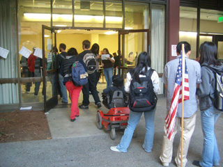 ブッシュ政権がいかにひどかったか、ということと同時に、「アメリカをひとつにする」と言い放ったオバマが最初から勝利していたと言えます。ここ にいると、大統領選挙とは、何よりもアメリカ・ナショナリズムの祭典であることがわかります。写真の右を良く見ると、学生がアメリカの星条旗を掲げている のが見えますね。アメリカ・ナショナリズムはイコール、デモクラシーや自由という「希望」です。これは日本が逆立ちしても追いつけない質のナショナリズム で、ちょっと羨ましい気持ちもします。オバマは、いわば草の根の、若い人たちのボランティアによって勝利しました。それは「キャンペーン」ではなく、 「ムーブメント(運動)」だったのです。