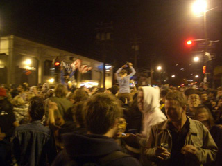 今、夜の12時過ぎですが、さっきまで、大学とその前のテレグラフ通りでは大騒ぎでした。警察も出ていましたが、喜びに満ちた平和的なものです(写真右)。