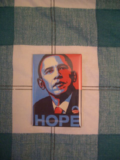 (写真は、オバマさんのワッペンです。この肖像のポスターが街の至る所に貼られています。彼は真の「United Nation」(ひとつのアメリカ)をつくりだす、庶民のまさに「Hope」なのです。)