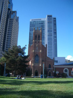 昨日夜、アメリカに来てから初めて本格的な雨が降り、今日も朝方は曇り空でした。そのせいかもしれませんが、「サンフランシスコ」の第一印象は、 ぼくがこの地名にもっていた燦然と輝くイメージほどではありませんでした。街の造りなども、たとえばシドニーの中心街とあまり変わらないかな、という感じ です。(写真右は、ぼくが行った中で一番きれいだと思った、Yerba Buena Gardens から見た St.Patrick's Church です。ちょうど結婚式をやっていましたが、この教会の右奥にちょこっと低く見える建物が「ユダヤ博物館」です。)