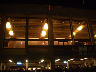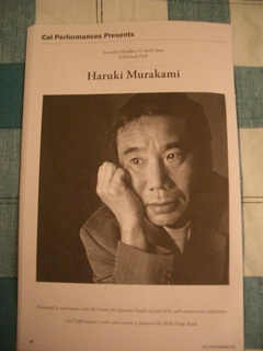 今晩は、私が所属する日本研究センター(CJS)主催の村上春樹さんのトークショーでした。会場は、キャンパス内の「Zellerback Hall」という大きな劇場です(写真右が会場)。千人前後は入る会場が満席で、チケットはすぐに売り切れ。ぼくは研究員なので、特別後でタダでチケット をいただき、ラッキーでした。ぼくの隣には中国人、その隣には台湾人のいずれも若い学生が座ったのですが、彼らは中国語で読んで、ファンになったと言って いました。とにかく世界中にものすごい数のファンがいる事実に改めて気がつきました。