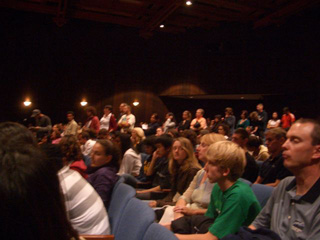 まず、開始15分前には行ったのですが、会館のまえには、約300mぐらいの列ができていました。ほとんどが若い学部学生のようだったので、「何 か履修届か何かの列かな」と思い、並んでいる学生に聞くと、「ああ、これは以前テロリストだった人の話の列です」との答え。夜の7時に、授業が終わった後 に、こんな若い人たちがこんなシビアな企画に千人以上も集まるとは。