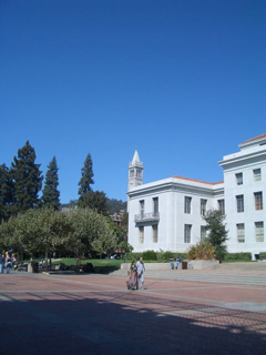 もう一枚の写真(右)は、バークレー校内のスナップです。奥に見えるのがシンボルの時計台です。ここからいつも美しい鐘の音がします。