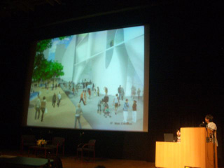 講演でも、冒頭、大学の新しい美術館&フィルム博物館のコンセプトについて時間を割き、キャンパスと街、アカデミズムと市民、内と外、街と自然とを相互につなげるための様々な工夫を説明していました。「住民なっとく」というところだと思います。