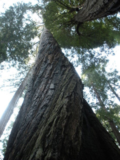 こちらでレッド・ウッド(Redwood)と呼ばれる杉(?)の木が密集する、西部開拓前のアメリカの姿を残した公園です。レッド・ウッドは湿気 にもシロアリにも強く、そのため大量伐採され、今ではこのような公立の公園などにしか残っていないようです。公園内では、高さが約40メートルから大きな もので70メートルを超える無数のレッド・ウッドの中を散策しました。数百年~千年の時を経た木の肌目は厳つくねじれているものもあり、見上げると写真の 右のように見えます。
