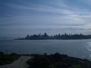 写真の左は、アルカトラズ島から見たサンフランシスコの街です。とても近いのがわかります。距離だけで言えば、ぼくでも泳いで渡れそうです。刑務 所の囚人たちも、都市の喧噪が聞こえたといいます。このように「シャバ」がとても近いにもかかわらず、島の周りの海流は速く冷たく、サメもいて、脱出不可 能といわれていた有名な刑務所です。今は、国立公園の一部で、観光地になっています。