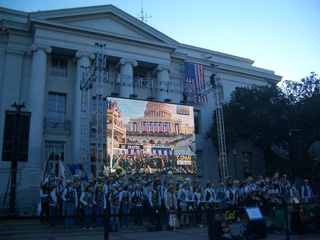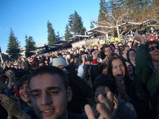 UCバークリーの「フリースピーチ運動」発祥スポットである、キャンパス内の「Sproul Plaza」には、写真左のような大きなテレビが設置され、それを広場にあふれかえる教職員・学生たち(写真右)といっしょにみました。