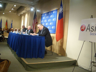 アメリカ国旗と台湾国旗が掲げられ、中国と北朝鮮は「問題」として取り上げられる図式。なぜか日本は総領事が会場にきていたにもかかわらず、パネラーとしてはアマコスト氏が出てきていました。