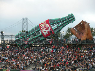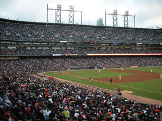 AT&T Park は、外が海になっているので、場外ホームランはボールが海に落ちます。あいにく少し遅れていったので、ホームランは見られませんでしたが、超満員のアメリ カの大衆がどのようにベースボールを楽しむのかを見ることができました。ナイターだったせいもあったのか、前回の空席が目立った「Aズ」の試合と全然ちが いました。