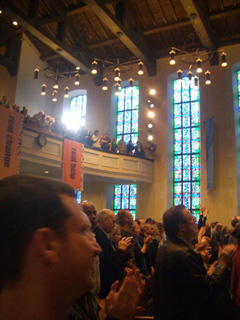 まず前者のゴスペルによる礼拝は、ニューヨークで体験しそびれたので、初体験となりました。11:00~12:30の約90分の礼拝の中で、約 60分ぐらいは歌を歌ったり、聴いていた気がします。つまり、「礼拝」というよりも、「コンサート」といった印象です。写真(左)にあるように、参加者 は、礼拝中ほとんど総立ちで、手拍子をし、身体を揺らしているわけです。