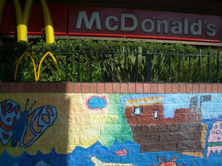 写真(中)を見てください。この街ではマクドナルドまでがキャンバスです。無数のプロ、アマの「アーティスト」たちが、街中を「アート」すること で、街全体が楽しく明るくなり、犯罪や落書きも減っていったといいます。街の住人達は、自分の家屋やガレージを快くキャンバスとして提供し、アーティスト たちは、存分に自分たちの歴史や願いを壁画を通じて語ります。