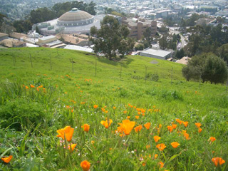 この教育施設は、以前ぼくが「潜入」に失敗した「ローレンス国立研究所」のさらに上にあって、研究所を見下ろすことができます。真ん中の写真の左 に見えるのが、「Advanced Light Source」と呼ばれる、おそらく研究所の中心部に位置する施設です。わざと、春の花といっしょに写真に収めました。