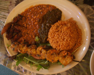 そして最後が、いろいろな伝統料理の載ったプレート(写真右)。エビの焼き物にレモン風味のソースがかけてあるもの、海藻やライスの炒めたもの、豆の蒸したもの、そしてプランテーンと呼ばれる調理用バナナの揚げ物などです。