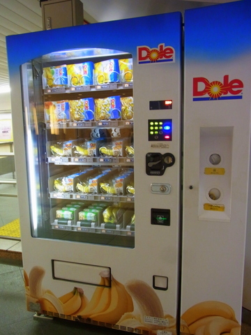 東京メトロ 丸の内線 東京駅の改札横にある、バナナの自動販売機。 「ボビーバナナ1本」「ボビーバナナ1房」「野菜チップス」「ドライマンゴー」「バナナチップ」などが売っています。