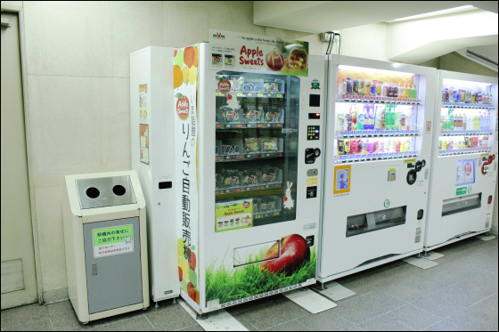 東京メトロ丸ノ内線霞ヶ関駅改札外にある「アップルスイーツ」という自動販売機。 「アップルスイーツ白(皮なし)」「アップルスイーツ赤(皮つき)」「とろーりはちみつ&生リンゴ」「とろーりキャラメル&生リンゴ」が売っており、期間限定商品として「アップルスイーツ 青 (皮つき)」 や「梨スイーツ」といったものが売っている。