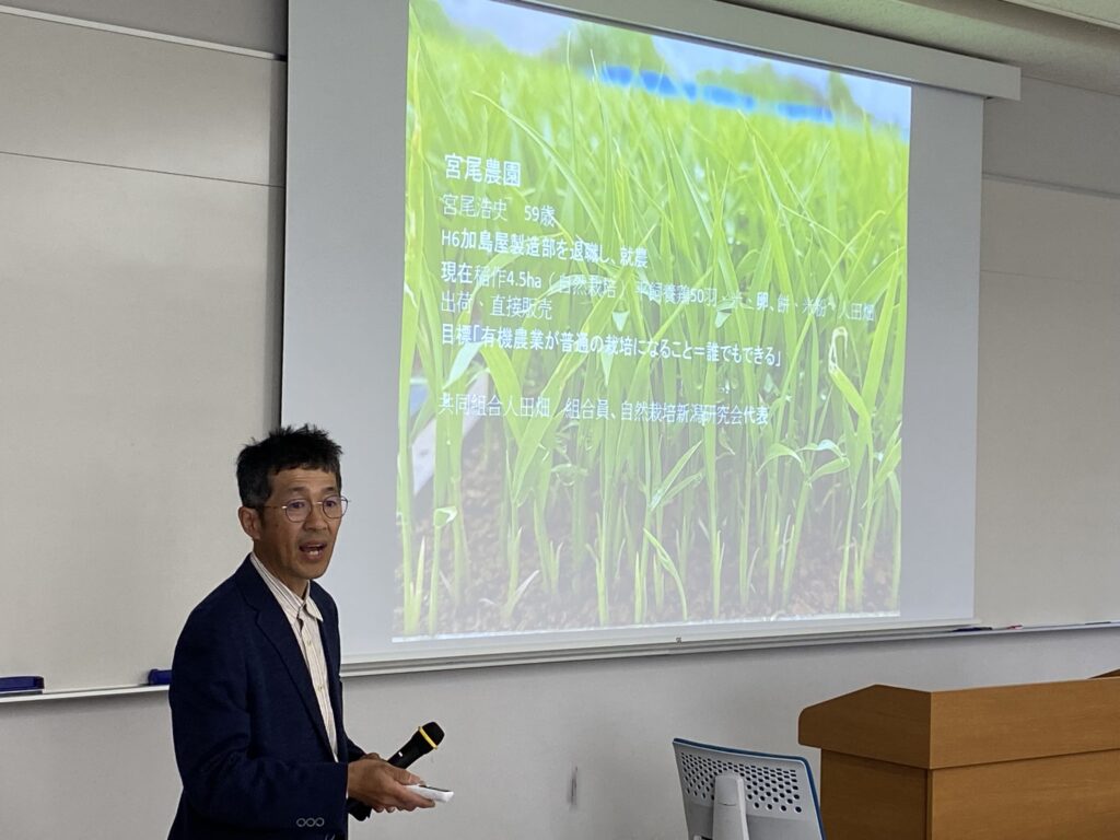 今回の講演は、「食と農のわくわくSDGs学習」プログラムの今年度第1回目として開催され、新潟市北区にある宮尾農園代表の宮尾浩史 氏を講師としてお招きし、日本・新潟の農業の現状や自然栽培、スマート技術(農業)の取り組みについて講演をいただきました。