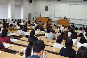 1年次生から4年次生までの全学部・学年の保護者を対象とした全体説明会では、野崎学長から大学の取り組みについて、教務委員長からは学修について、キャリア支援委員長からは就職について説明がありました。