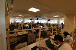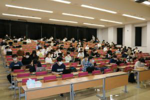 新型コロナウイルス感染防止対策として、教室における受講者数は収容人数の50%以下とし、周囲との空間を確保しています。受講者が50%を超過した授業は、他の教室へ対面授業の映像をリアルタイム配信して受講するハイブリッド授業を行っています。