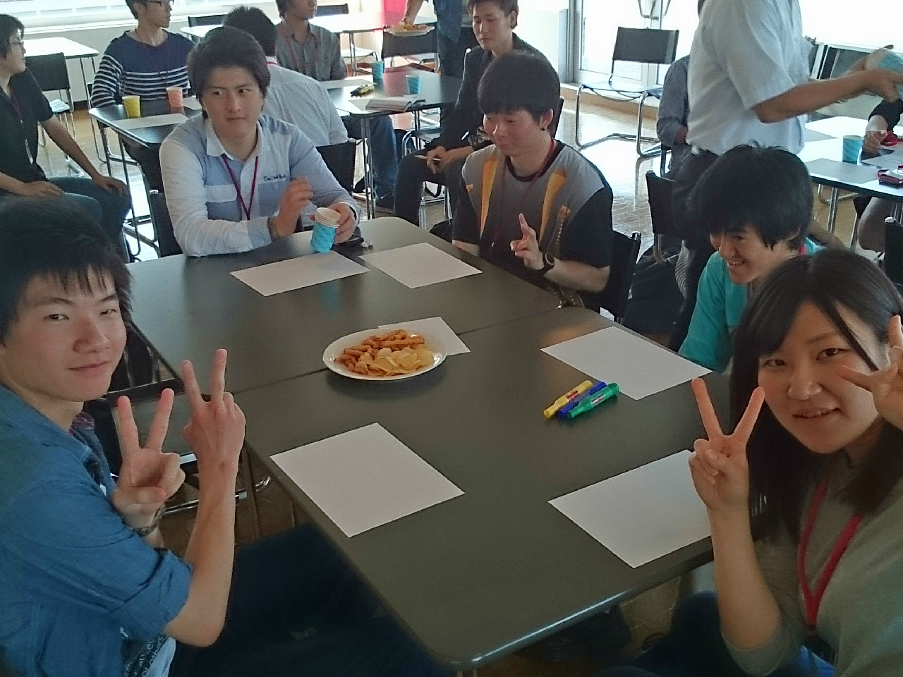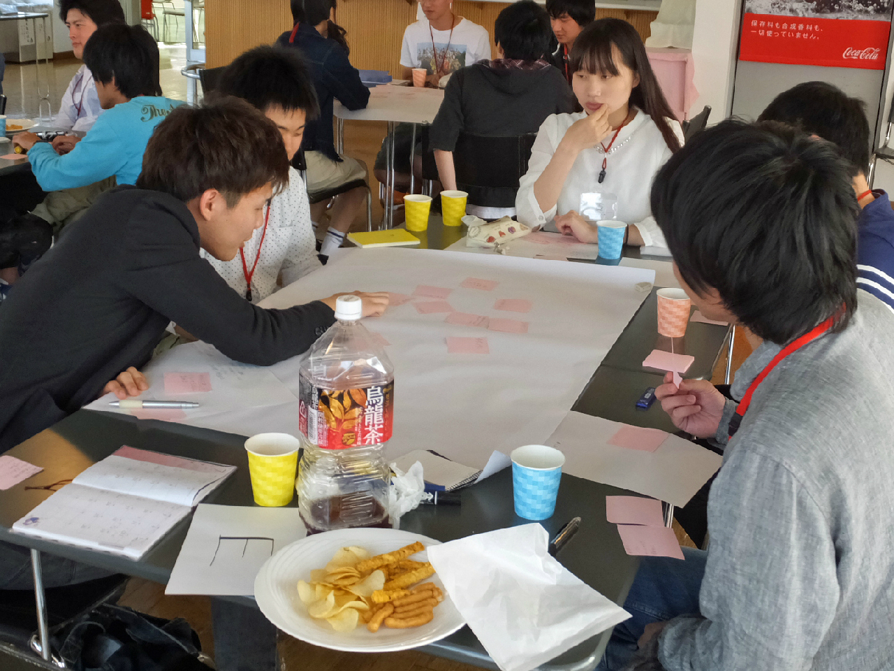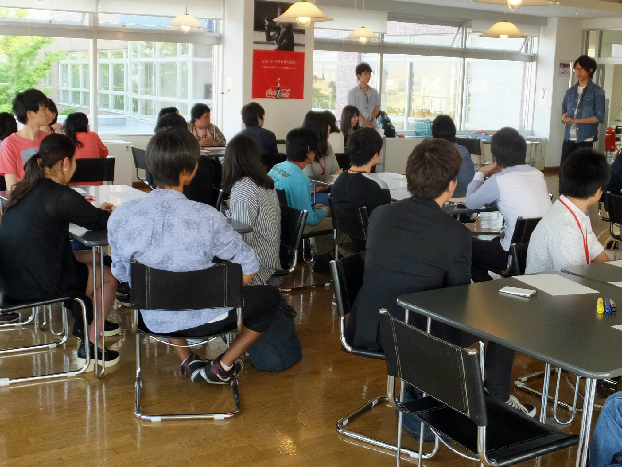 平成27年5月27日(水)本校(みずき野キャンパス)の喫茶コンティニューにて「平成27年度 第1回CareerCaf?(キャリアカフェ)」を行い、33名が参加しました。「CareerCaf?」とは、カフェスタイルの空間で学年の垣根を越え、テーマを設けず自由に会話を楽しむイベントです。毎回、大学生活や就職活動など様々な悩みや相談ごとを話し合います。1~3年次生は6つの班に分かれ、各班に4年次生がマスター役で入り、模造紙にこれからの学生生活でやりたいことを文字や絵などを交え表現しました。参加者は、楽しく有意義な時間を過ごしました。
