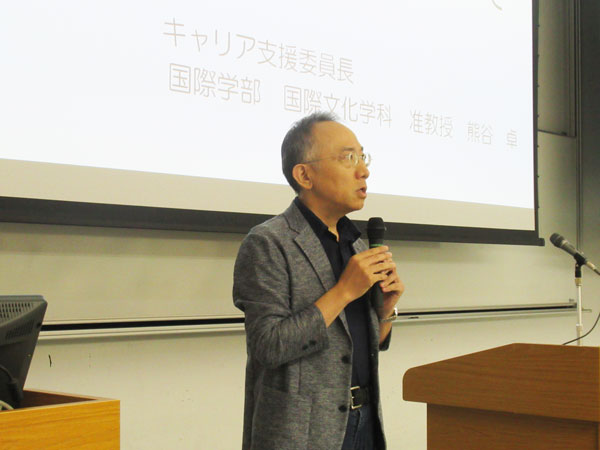 学生一人ひとりに、自分自身のキャリアと社会との関わりを考えてもらうためのガイダンスです。働くことの意味、そして勉強から資格、課外活動など、いかに学生生活を充実させるかを中心にアドバイスします。