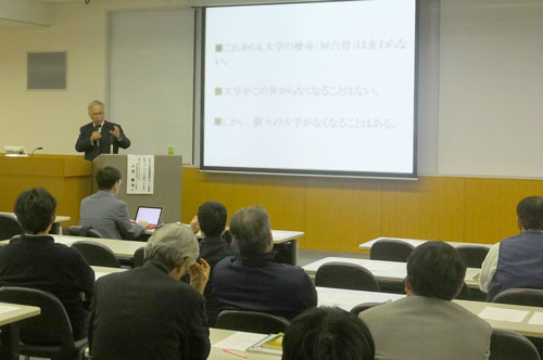 研修会は二部構成で行われ、第一部では、山形大学教育開発連携支援センター長教授 小田 隆治氏をお招きして、『今、NUISに必要なFDを問う』と題し、ご講演いただきました。現代の大学事情を踏まえ、教育改革の必要性とFDについて全般的な内容から山形大学の先進的な事例について紹介があり、講演後、活発な質疑、意見交換が行われました。