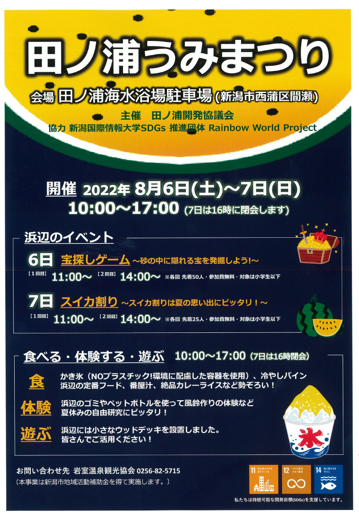今年も同海水浴場で「田ノ浦うみまつり」が開催されます。昨年に続き、RWPが企画・運営に参加し、SDGsの紹介や環境に配慮したかき氷の販売、浜辺のごみやペットボトルを使った風鈴作りの体験企画などを実施します。ぜひご来場ください。