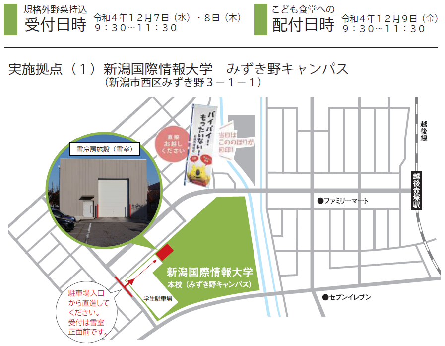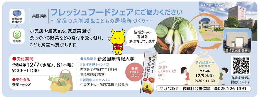 この度、本学と新潟市は、実証事業として「フレッシュフードシェアリング」を以下の期間にて実施することとなりました。これは、小売店や農家さん、家庭菜園で余っている野菜などの寄付を本学で以下の期間に受け付け、これを新潟市内のこども食堂へ提供するという取り組みになります。