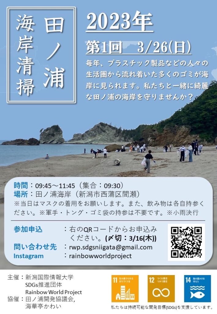 本学の「SDGs推進団体 Rainbow World Project」は、本学が参加する「新潟にしかん地域循環共生圏協議会」の活動の一環として、2021年から田ノ浦海水浴場で海岸清掃を定期的に実施しています。