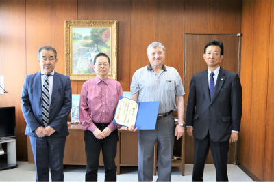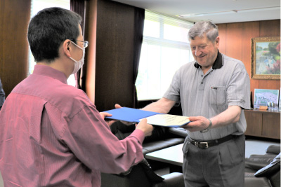 2023年6月7日(水)、本学にて名誉教授称号記授与式が行われました。越智敏夫学長から、今年3月に本学を退職されたアレクサンドル・プラーソル名誉教授へ称号記が授与され、教育研究の功績及び本学発展の寄与に対し、感謝の言葉が述べられました。
