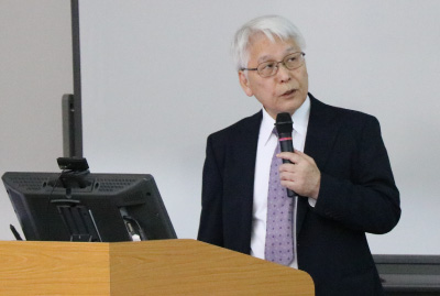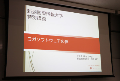 1年次講義科目「情報システム」(小林満男教授)では、情報システムを理解するうえで必要な基本的考え方と基本技術、応用分野について深く学んでいます。特に、社会や企業などの人間活動とのかかわりを重視し、情報システムが必ずしもコンピュータ中心のシステムではないことを認識し、情報システムを考えるときには広い視野に立ったものの見方が必要なことから、この度、大手ソフトウェア開発会社を飛び出し創業し、そして現在、R&Dを主軸として第一線で活躍されているコガソフトウェア株式会社 代表取締役社長 古賀詳二様を講師にお招きし「コガソフトウェアの夢」と題して、