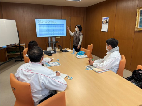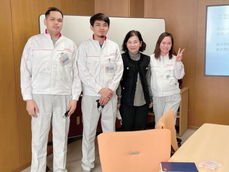 写真は、富士通フロンテック新潟工場で、企業内教育の一環で、外国人技術者に日本語、日本事情を教えたときの様子です。