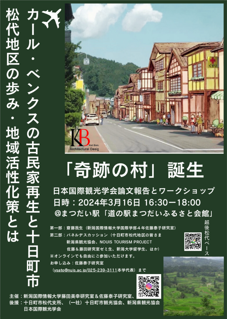 このイベントでは、本学 国際学部 国際文化学科4年齋藤我生(がくと)さんが研究した卒業論文「カール・ベンクスの古民家再生と十日町市松代地区の歩み−新潟県の地域の魅力を引き出す地域活性化に向けて−」を発表。この論文は、日本国際観光学会が発刊する学会誌(Vol.7, 2023)に掲載されました。