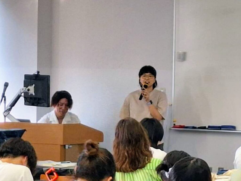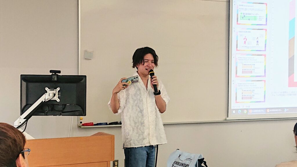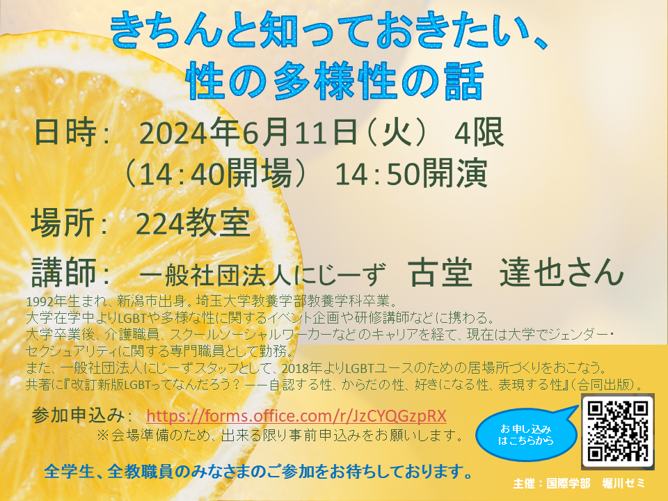 2024年6月11日(火)4限に、本校キャンパス内において、国際学部堀川ゼミの公開授業として「きちんと知っておきたい、性の多様性の話」の特別授業をおこないました。講師には、東京都内の大学のジェンダー・セクシュアリティに関する専門職員として勤務され、一般社団法人にじーずスタッフとして、2018年よりLGBTユースのための居場所づくりをおこなう古堂達也さんと、にじーず新潟スタッフ(LGBTQここラテにいがた代表)のあやかさんにいらっしゃっていただきました。国際学部からはゼミ単位での参加もあり、約100人の学生、教職員が参加しました。