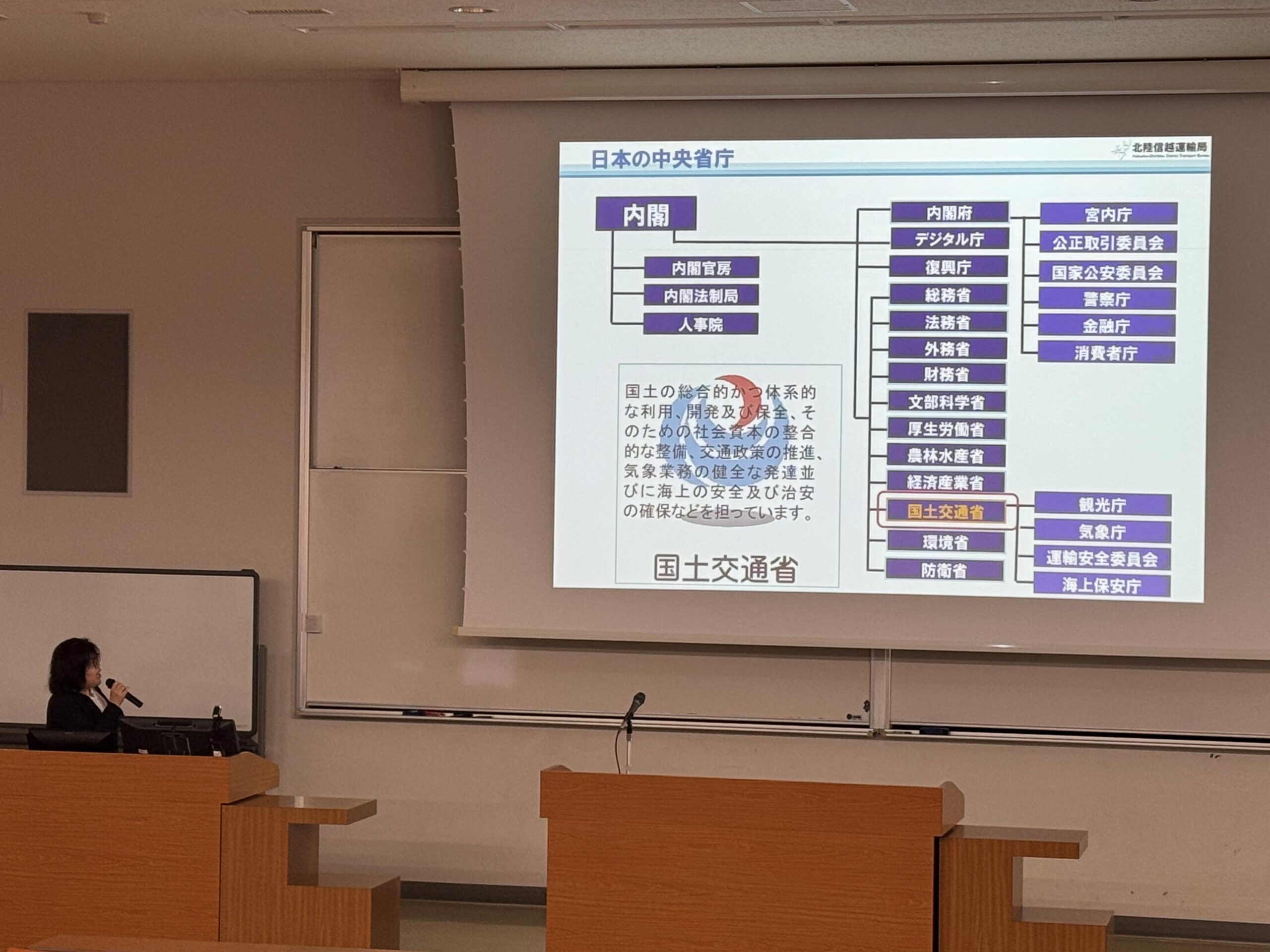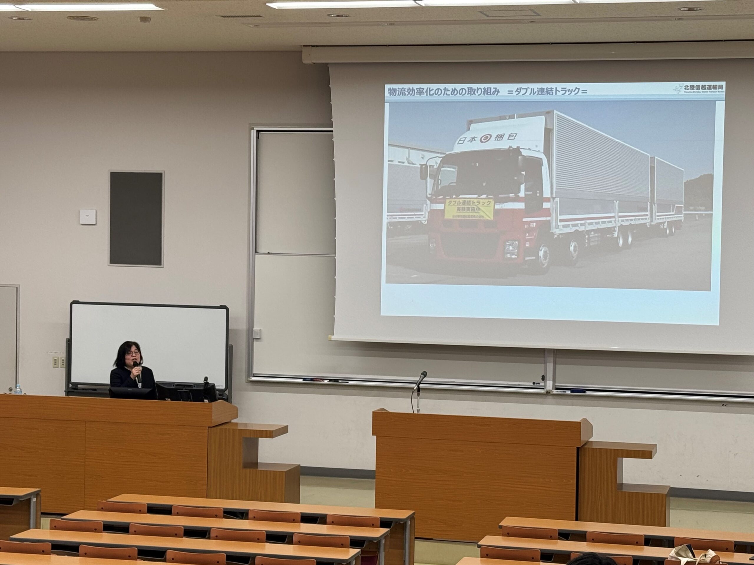 2024年12月5日(木)国土交通省 北陸信越運輸局 交通政策部 環境・物流課の芦澤千恵子様を講師にお招きし「持続可能な物流の実現をめざして~物流を学び、守り、支える~」と題してご講演頂きました。聴講した約100名の学生は、物流が自分たちにとっても身近な存在であることを再認識するとともに、持続可能な物流の実現について「私たちにも出来ること」を考えるよいきっかけとなりました。特別講義の後も、物流への興味や関心を抱いた感想がたくさん寄せられました。