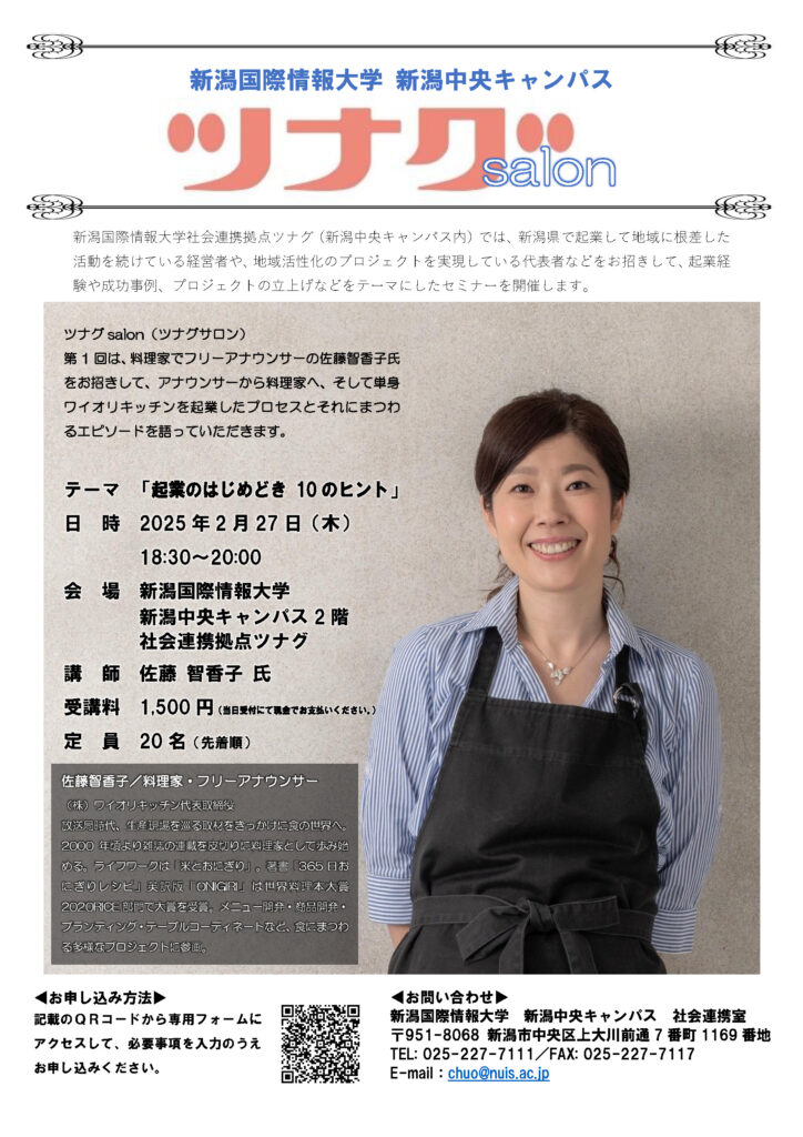 新潟国際情報大学社会連携拠点ツナグ(新潟中央キャンパス内)では、新潟県で起業して地域に根差した活動を続けている経営者や、地域活性化のプロジェクトを実現している代表者などをお招きして、起業経験や成功事例、プロジェクトの立上げなどをテーマにしたセミナーを開催します。