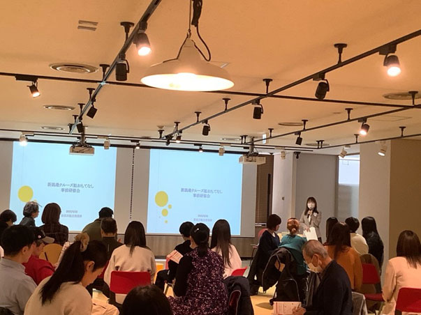 事前準備として、新潟市職員や古町商店街、伊勢丹、本研究室の協力のもと、ボランティアとしての心構え、よくある質問への対応、古町の飲食店情報などについてレクチャーを受講。また、外国人講師を迎えたワークショップでは、実践的なシミュレーションを重ねて本番に備えました。