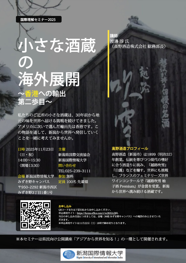 令和7年11月23日(日)本校みずき野キャンパスにて、「国際理解セミナー」を開催します。(公財)新潟県国際交流協会、(公財)柏崎地域国際化協会、新潟医療福祉大学、新潟食料農業大学、そして本学が主催する本セミナーは、アジア諸国の歴史や文化などについて、各分野の専門家が分かりやすく、そして楽しくお伝えします。全4回の講演の中で、4回目の本学講演では、高野酒造株式会社 総務部長の渡邊淳氏を講師としてお招きします。