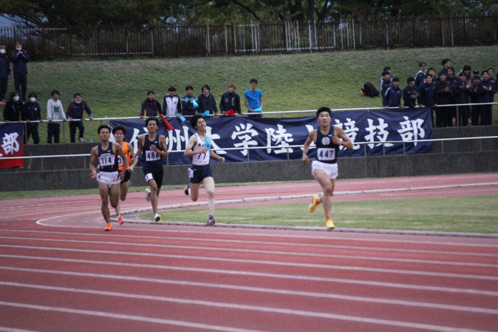 初日に行われた男子800mの予選(6組1着+2)では、岩島力さん(経営学科3年)が1分59秒68を出して3組1着で予選を通過しました。そして、決勝では1分59秒26の記録で4位入賞を果たしました。