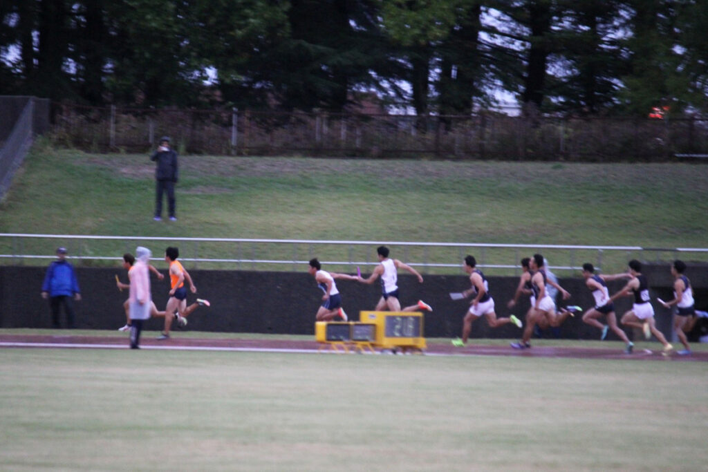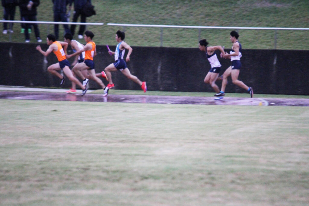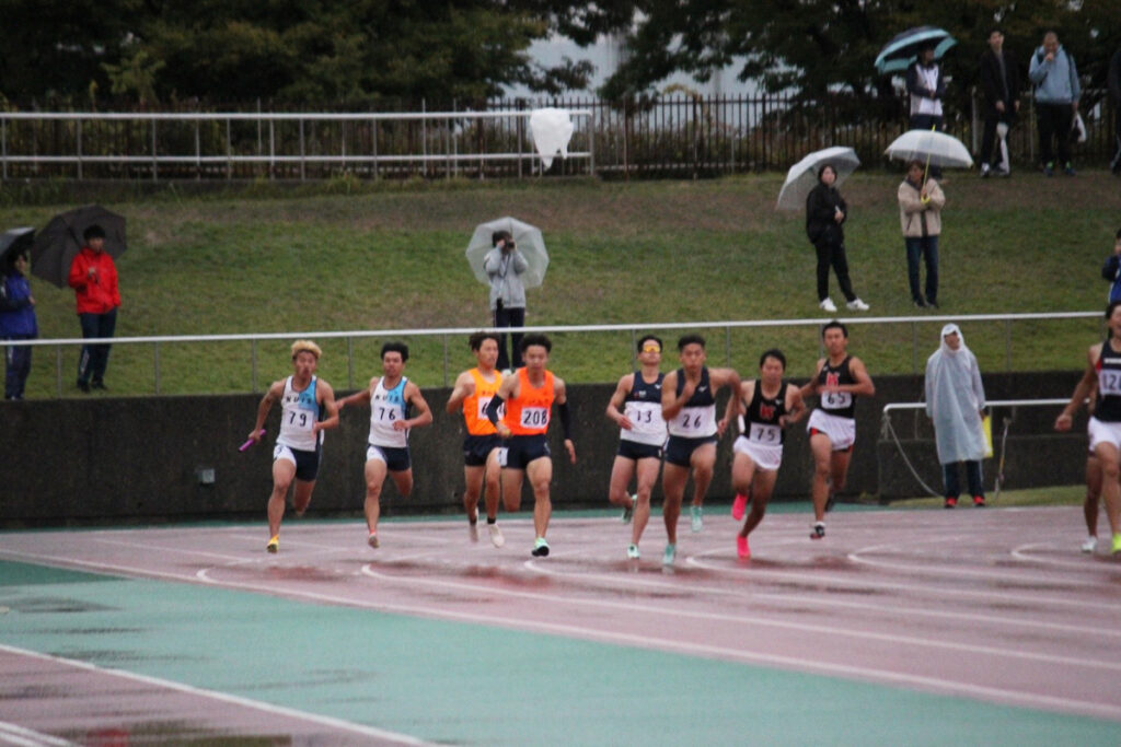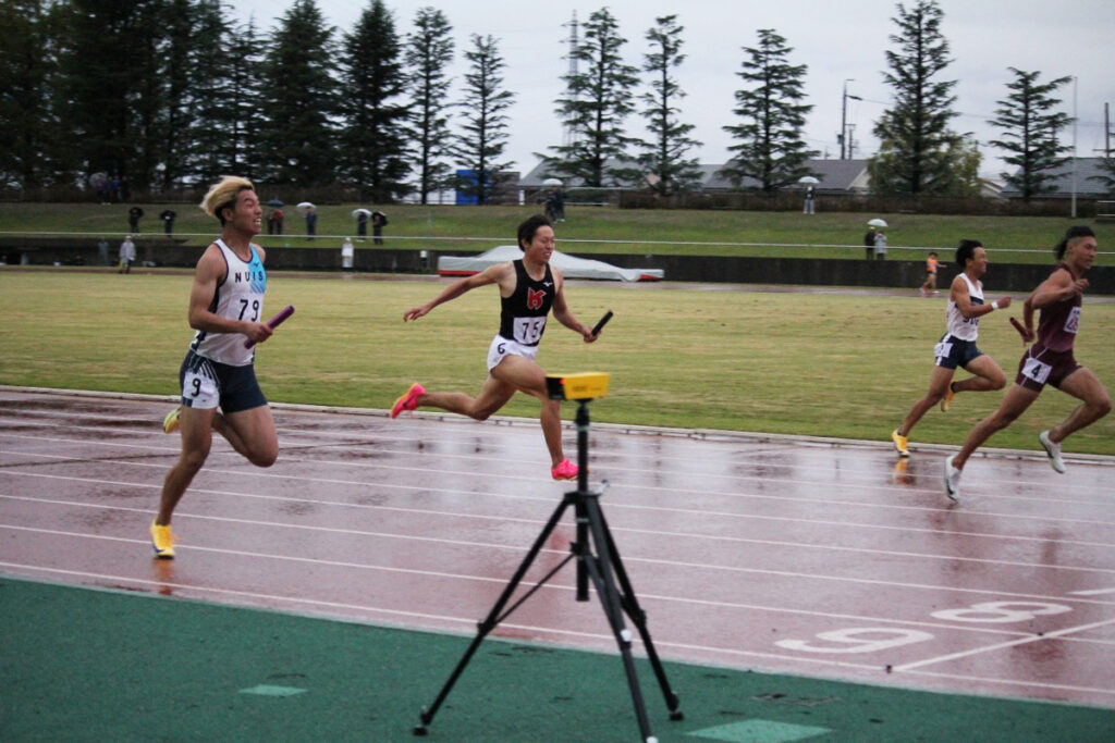 また2日目は雨で10℃近くの低温の中で競技が実施されました。男子4×100mリレーの予選(3組2着+2)で本学チーム1走 久保田陽太さん(経営学科1年)・2走 井藤希さん(情報システム学科3年)・3走 風間結斗さん(経営学科3年)・4走 竹内劉桐さん(国際文化学科1年)は42秒89の記録で2着となって決勝進出を果たしました。決勝では1走を井黒裕貴さん(経営学科1年)が走り、他は同メンバーで42秒54の記録で6位入賞を果たしました。