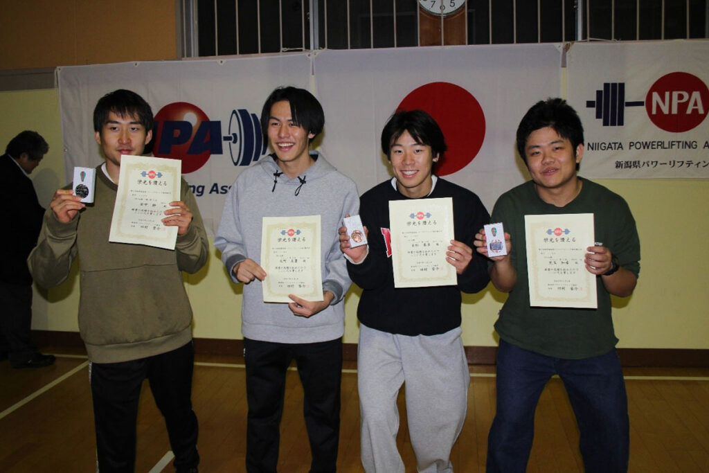 男子選手の成績は、53㎏級の渋谷駿介さん(検量52.1㎏)はTL437.5㎏(SQ155・BP107.5・DL175)で3種目全て大会新記録を出しました。その他、初出場の赤松奏多さん(国際文化学科1年:66㎏級)と児玉知希さん(情報システム学科1年:83㎏級)がそれぞれTL357.5㎏(SQ115・BP92.5・DL150)とTL380㎏(SQ145・BP75・DL160)、また反町友翼(国際文化学科1年:66㎏級)がTL335㎏(SQ120・BP70・DL145)、宮崎想司さん(経営学科2年:74㎏級)が435㎏(SQ152.5・BP112.5・DL170)、伊藤広大さん(経営学科3年:74㎏級)が455㎏(SQ170・BP110・DL175)で、初出場以外の全員が自己新記録を出しました。