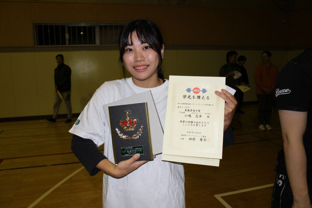 小嶋志歩さん(経営学科3年)は女子57kg級(検量54.65kg)に出場し、トータル292.5㎏(スクワット107.5kg・ベンチプレス60kg・デッドリフト125kg)の大会新記録を出して女子の最優秀選手に選ばれました。また熊倉実子さん(経営学科2年)も女子69㎏級(検量66.75kg)で265㎏(SQ102.5・BP47.5・DL115)の大会新記録を出しました。