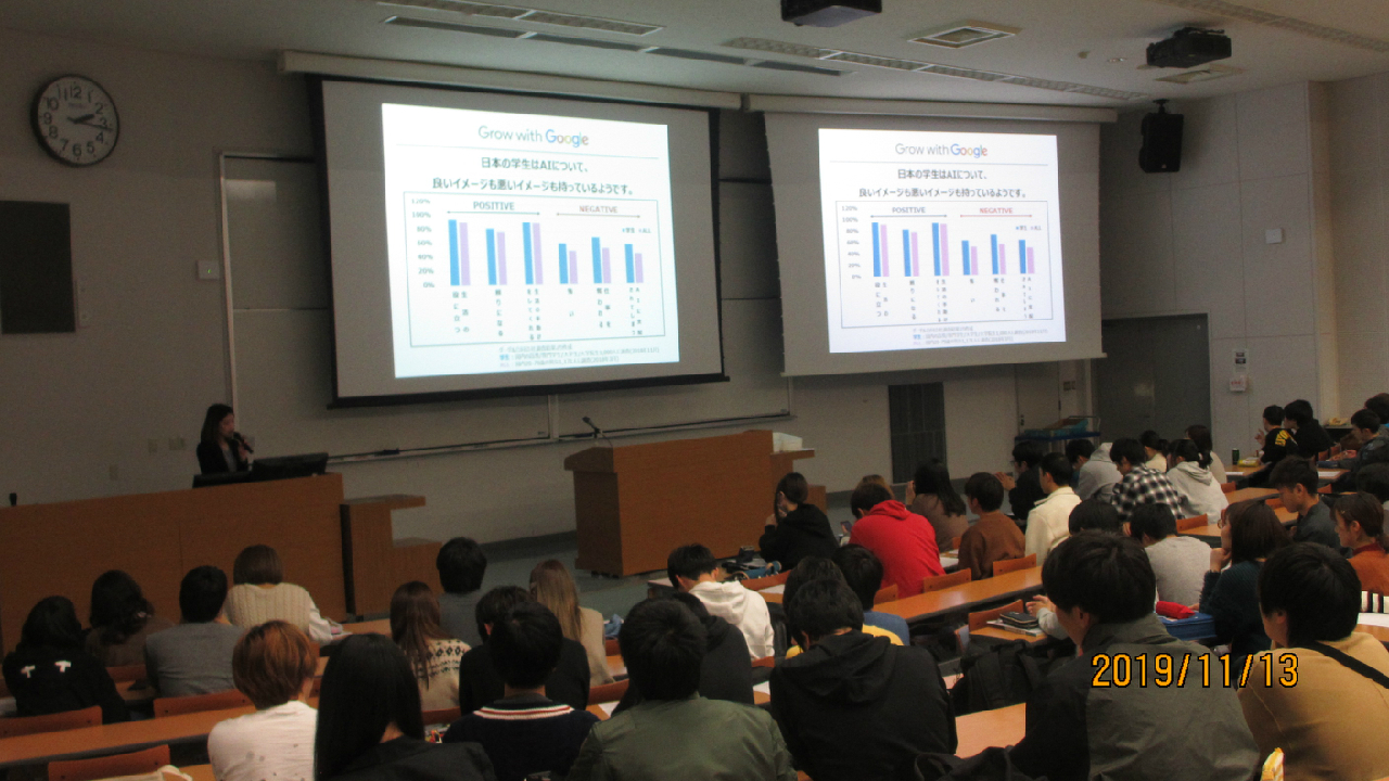 2019年11月13日、第8回「キャリア開発1」において「企業課題解決型 導入編」を実施いたしました。学生はGoogleがYoutubeに公開している動画「きゅうり農家」のAI導入実例について、基礎的な理解を深め、関心のある社会課題や学生自身が考えている課題など、身の回りや日常生活で困っていることをグループに分かれ課題を出し合いました。日常生活からの課題抽出が比較的難しく時間がかかるグループもありましたが、アイデアを考え自由に発想する仕組みを学びながら課題解決に取り組んでいました。