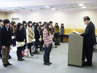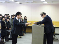 平成23年度資格取得奨励奨学金授与式を、平成24年1月17日(火)に本校にて行い、63名の学生にそれぞれ奨学金を授与しました。対象となった学生は、TOEICなどの語学、情報処理関係、簿記、ファイナンシャルプランニング技能検定等の資格取得者で、Ⅰ種(難度の高いもの:50,000円授与)6名、Ⅱ種(社会的評価に値するもの:20,000円授与)57名の合計63名でした。授与された学生の皆さん、大変おめでとうございました。