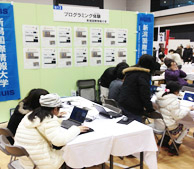 本学では「プログラミング体験」というタイトルで展示をしました。ブースでは、子供でもキーボードをバタバタと叩くとコンピュータプログラムが完成する「疑似プログラマー体験」と、お絵かきのようにプログラムを作るプログラミング教育用のソフトウェア「Scrach*」を体験してもらいました。来場者はこの体験を通じて、普段のテレビゲームなどでは味わえない「作る楽しさ」を学んでいました。